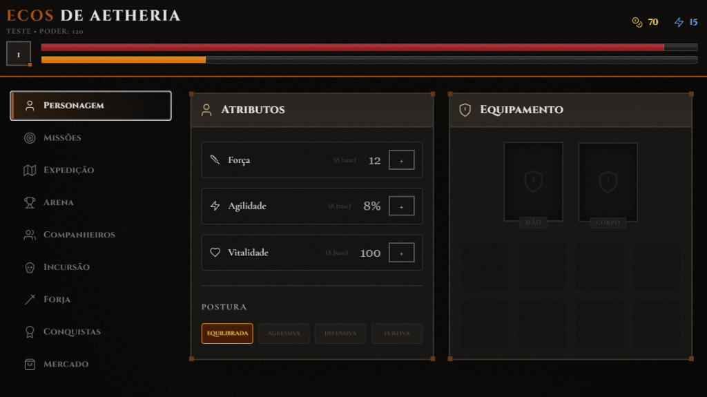 Um RPG incremental de ação sombrio. Evolua seu personagem, gerencie atributos e conquiste a arena de Aetheria.